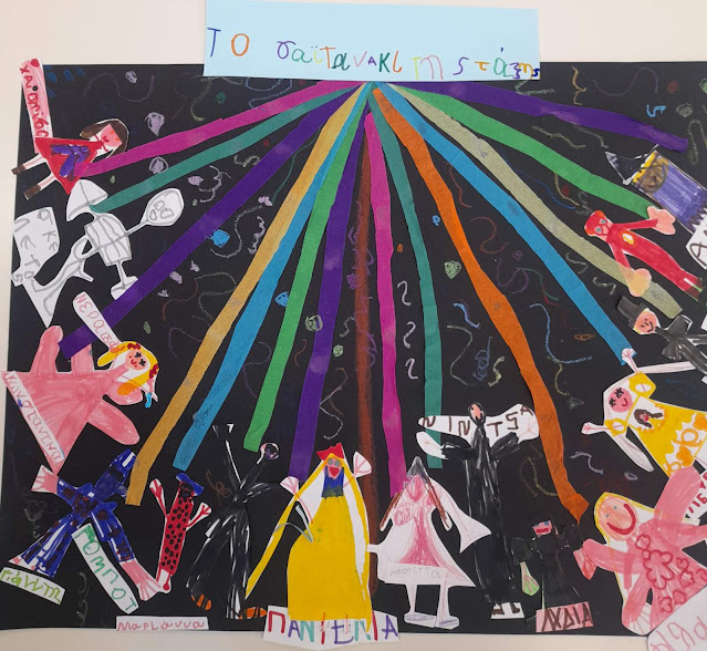 Στο πνεύμα της αποκριάς τα παιδιά διασκεδάζουν δημιουργικά και πολύχρωμα! Μιλήσαμε για τις μεταμφιέσεις, τους καρναβαλιστές, τις καρναβαλικές εκδηλώσεις και για πολλά άλλα έθιμα ανά την Ελλάδα. Ένα από τα πιο γνωστά αποκριάτικα έθιμα είναι το Γαϊτανάκι! Είδαμε φωτογραφίες για το γαϊτανάκι, πως ήταν ντυμένοι οι χορευτές παλιά και πως είναι τώρα, μετρήσαμε τους χορευτές και προχωρήσαμε στον συμβολισμό του αριθμού 12, όσοι είναι και οι χορευτές. Σύμφωνα με την παράδοση τα 12 γαϊτάνια, (οι κορδέλες) που τυλίγονται και ξετυλίγονται αρμονικά γύρω από το κοντάρι στο οποίο είναι δεμένες, συμβολίζουν τους 12 μήνες του χρόνου, την εναλλαγή από την μία εποχή στην άλλη, την αρμονική συνύπαρξη ανθρώπων και εποχών. Ακολούθησε ζωγραφική με λεπτομέρειες!